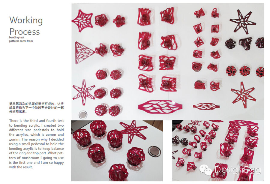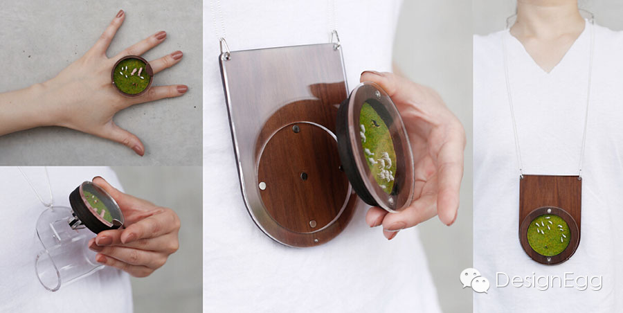 湉Tian:其实除了养殖蘑菇之外,我更多的尝试是对不同材料和首饰的结构之间的一些尝试。比如说这个菌类。它也是一个在首饰上的一个装饰的结构,然后我尝试了用不同的材料去对它做一些研究。最早起我是用纸去做它的纹理和做成不同的结构,怎么把它拼接起来。到后期我就尝试着用亚克力。这个是热弯的亚克力,也可以通过以为它亚克力本身的特质我对它进行一个重新的塑造,比较自然形态的一个处理。然后这个皮跟亚克力的不同之处是它本身是软的,但是我给它加的是硬化剂,让皮变硬,但是皮依然是这种柔软的质地。